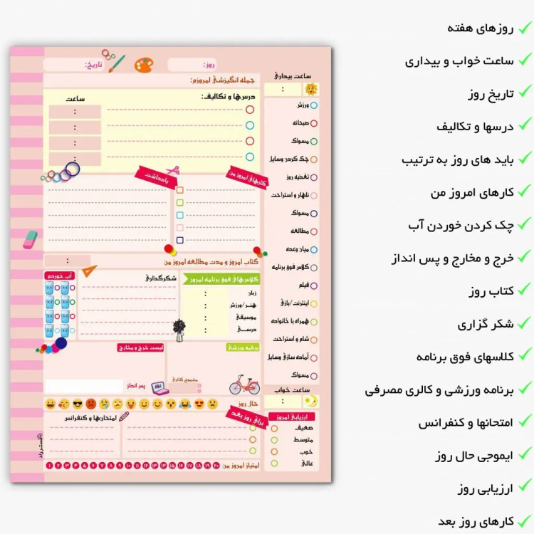 دفتر برنامه نویسی تحصیلی این دفتر دارای ۳۰ صفحه برای برنامه ریزی ۳۰ هفته و ۱۵۰ صفحه برای برنامه ریزی روزانه (۳۰ هفته) در مجموع ۹۰ برگ آ۵ بسیار کاربردی و مناسب برای برنامه ریزی تحصیلی برای دانش آموزان و دانشجویان. دارای قسمت های روز و تاریخ، یادداشت، کارهای روزانه به ترتیب و به صورت چک لیست، شکر گذاری، ایموجی روز، کتاب، دخل و خرج روز، برنامه ریزی ورزشی و کاری، چک کردم آب خوردن، کلاسهای فوق برنامه، کارهای روز بعد و ... نوع دفتر:پلنر ابعاد:20x15 تعداد برگ:90 برگ نوع صحافی :سیمی