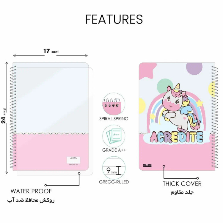 دفتر مشق طرح اسب تک شاخ ۵۰ برگ جلد منعطف دورو سلفون صحافی فنر مارپیچ.