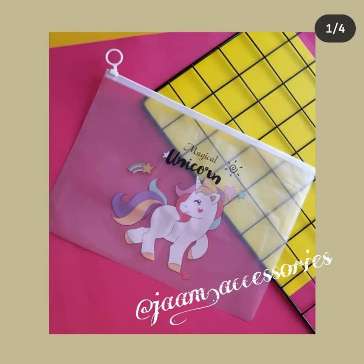 کاور نیمه شفاف طرح یونیکورن از جنس pvc قابل شستشو دارای زیپ کیپ سایز آ۴ کیفیت عالی قیمت هر عدد ۲۲۰۰۰ تومان