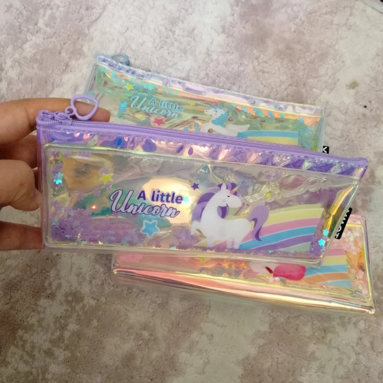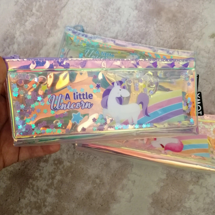 جامدادی هولوگرامی آکواریومی طرح یونیکورن در ۳ رنگ صورتی، آبی، یاسی ۳ وجهی سایز بزرگ تک زیپ کیفیت عالی ، مارک دار