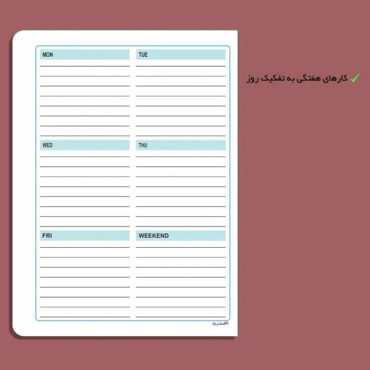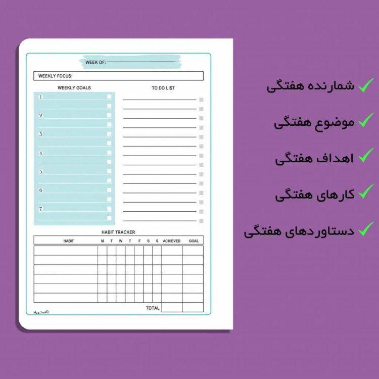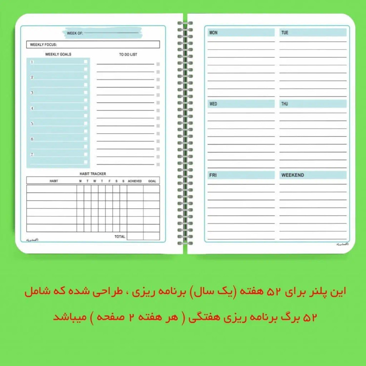 پلنر یا دفتر برنامه ریزی هفتگی موجود در ۲ رنگ صورتی و آبی دارای ۵۲ برگ برای برنامه ریزی ۵۲ هفته یعنی یکسال ( هر هفته دو صفحه.) هر هفته برای برنامه ریزی دارای قسمت های زیر هست: شمارنده هفتگی موضوع هفتگی اهداف هفتگی کارهای هفتگی دستاوردهای هفتگی